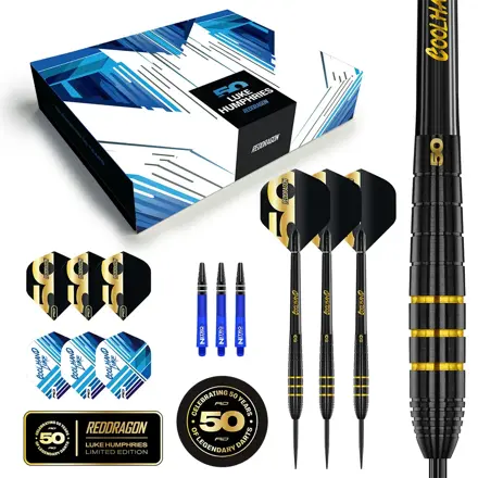 Luke Humphries – 50 Years Limited Edition jsou šipky, kde Luke vyryl své jméno do moderních šipek s neúnavnou přesností. Nyní jsou šipky, kterými se zapsal do historie jako mistr světa, šampion Triple Crown a světová jednička, zvěčněny v této ohromující limitované edici 50 let. Je to pocta jeho vzestupu, podaná ve směsi černého onyxu a 24karátové brilance.
